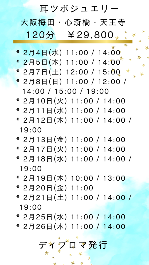 大阪梅田・心斎橋・天王寺で開催される耳ツボジュエリー資格講座の最新情報です。